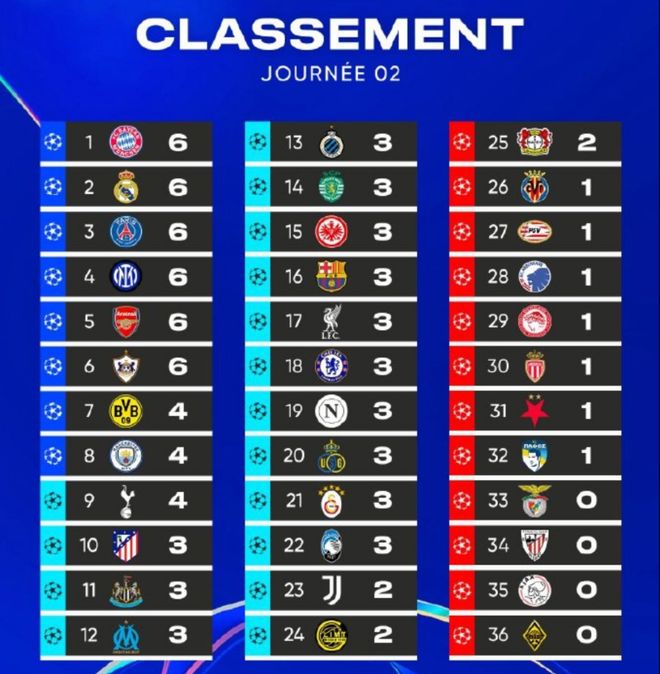 10月2日凌晨,多场欧冠比赛同时进行。至此,欧冠联赛阶段的2轮比赛全部结束。最新的积分榜上,几家欢喜几家愁。拜仁皇马等6队2连胜,而巴萨和利物浦则只有3分,药厂则位于淘汰区。