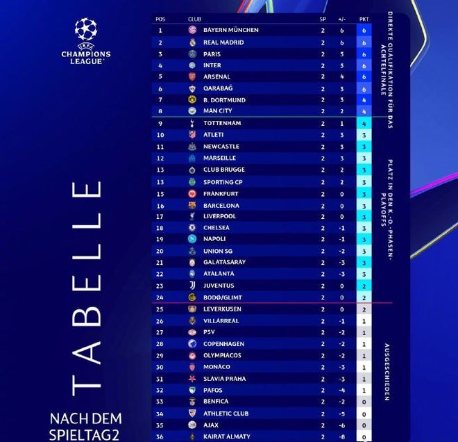 北京时间10月2日,欧冠联赛阶段第2轮比赛全部结束。本轮过后,最新积分榜也发生了巨变。